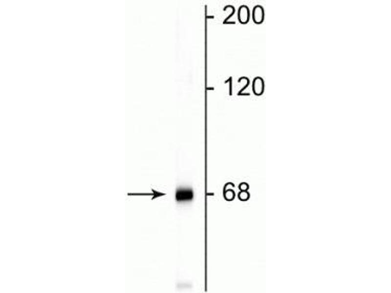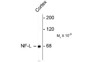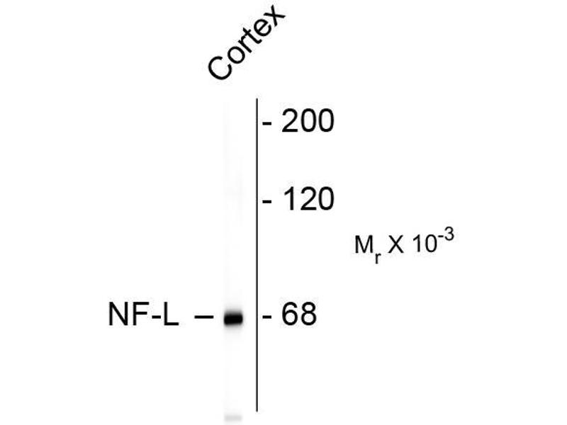 Neurofilaments are the 10nm or intermediate filament proteins found specifically in neurons, and are composed predominantly of three major proteins called NF-L, NF-M and NF-H (1). NF-L is the neurofilament light or low molecular weight polypeptide and runs on SDS-PAGE gels at about 68kDa. Antibodies to NF-L are useful for identifying neuronal cells and their processes in tissue sections and in tissue culture. Mutations in the protein coding region of the human NF-L gene cause some forms of Charcot-Marie-Tooth disease (2). Anti-Neurofilament L Western blot of rat cortex lysate showing specific immunolableing of the ~ 68k NF-L protein.