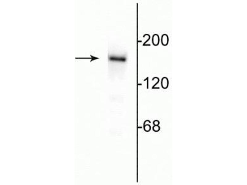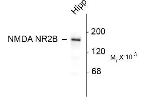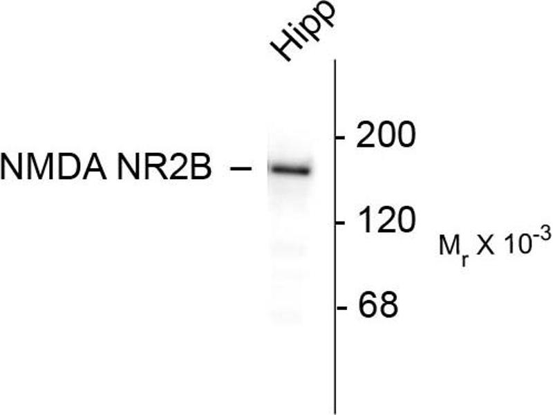 - Specific for endogenous levels of the ~180 kDa NR2B subunit of the NMDA receptor. Immunolabeling is blocked by preadsorption of antibody with the fusion protein used to generate the antibody. No reactivity towards the NR2A and NR2C subunits.