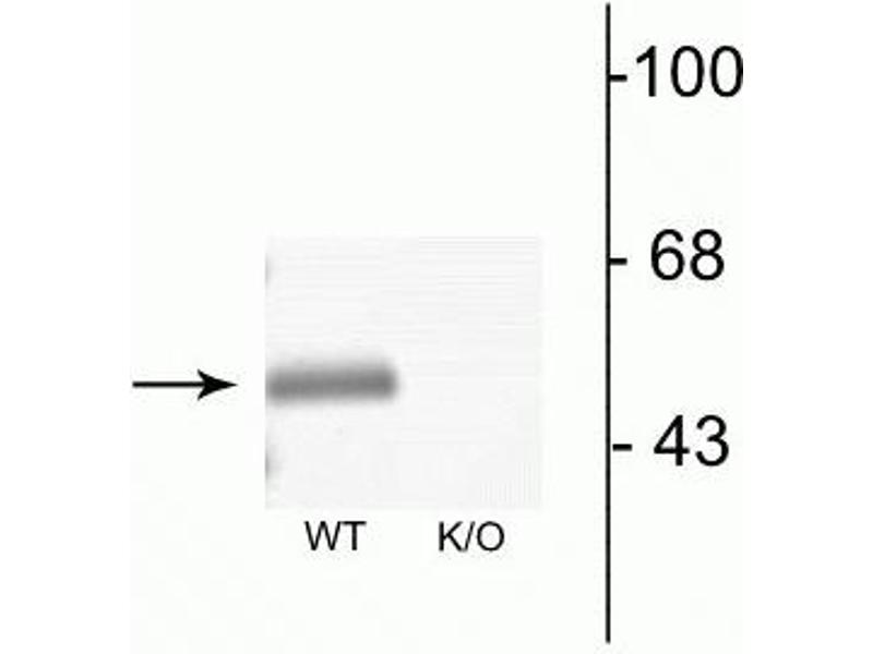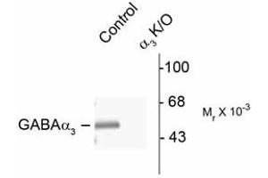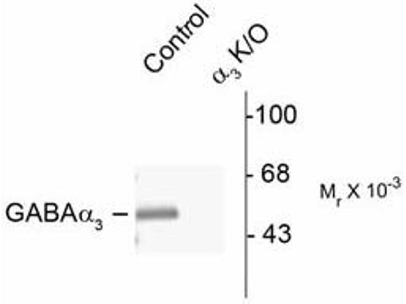 - Specific for endogenous levels of the ~51 kDa α3-subunit of the GABAA receptor. Immunolabeling is absent in α3-subunit knockout animals.