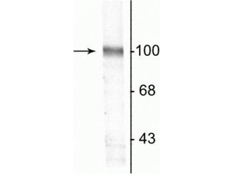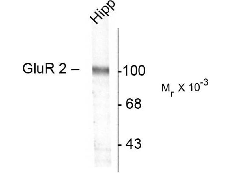 The ion channels activated by glutamate are typically divided into two classes. Those that are sensitive to N-methyl-D-aspartate (NMDA) are designated NMDA receptors (NMDAR) while those activated by (-amino-3-hydroxy-5-methyl-4-isoxalone propionic acid (AMPA) are known as AMPA receptors (AMPAR). The AMPAR are comprised of four distinct glutamate receptor subunits designated (GluR1-4) and they play key roles in virtually all excitatory neurotransmission in the brain (Keinänen et al., 1990,Hollmann and Heinemann, 1994). The GluR2 subunit is thought to play a key role in forms of synaptic plasticity such as LTD (Chung et al., 2003) Anti-GluR2 Western blot of a rat hippocampal (Hipp) lysate showing the specific immunolabeling of the ~100k GluR2 protein.