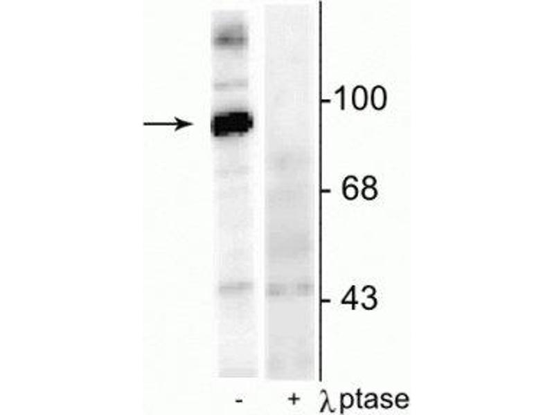 - Specific for endogenous levels of the ~95 kDa dynamin protein phosphorylated at Ser774. Labels the purified protein phosphorylated in vitro by cdk5 but not by PKC. Does not cross react with other purified substrates of cdk5 (e.g. amphiphysin and synapsin). Immunolabeling is blocked by λ-phosphatase treatment.