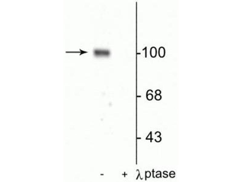 The antibody has been directly tested for reactivity in Western blots with rat tissue. It is anticipated that the antibody will react with human, mouse and non-human primate based on the fact that these species have 100% homology with the amino acid sequence used as antigen. Specific for the ~100k GluR1 protein phosphorylated at Ser845 in Western blots of rat brain extracts. Immunolabeling is blocked by the phosphopeptide used as antigen but not by the corresponding dephosphopeptide. Immunolabeling is completely eliminated by treatment with λ-Ptase.