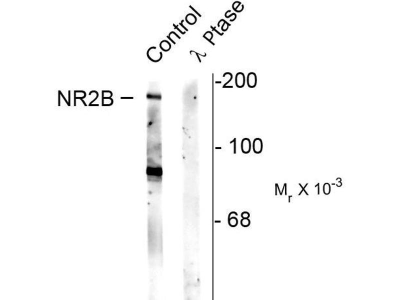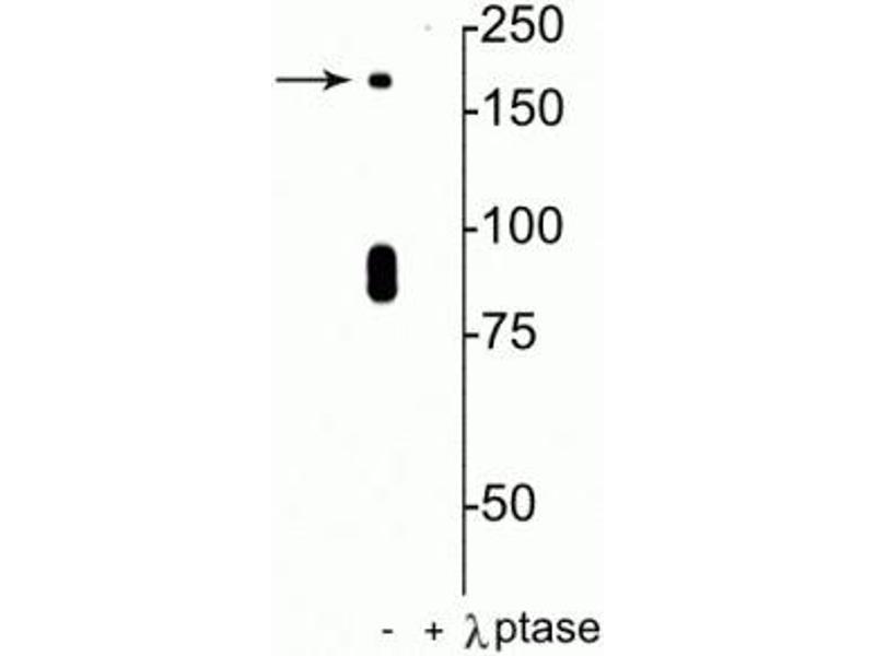 Specific for endogenous levels of the ~180 kDa NMDAR NR2B subunit protein phosphorylated at Ser1480. Immunolabeling is completely eliminated by treatment with λ-phosphatase.