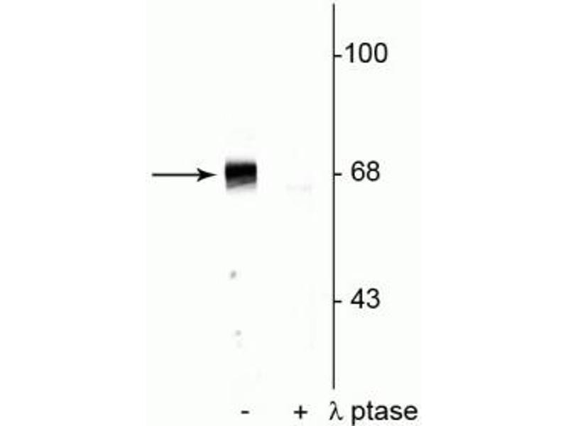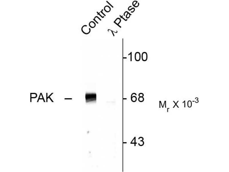 - Specific for endogenous levels of the ~68 kDa PAK protein phosphorylated at Thr402. The immunolabeling is completely eliminated by treatment with λ-phosphatase.
