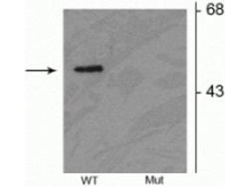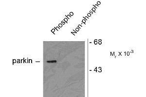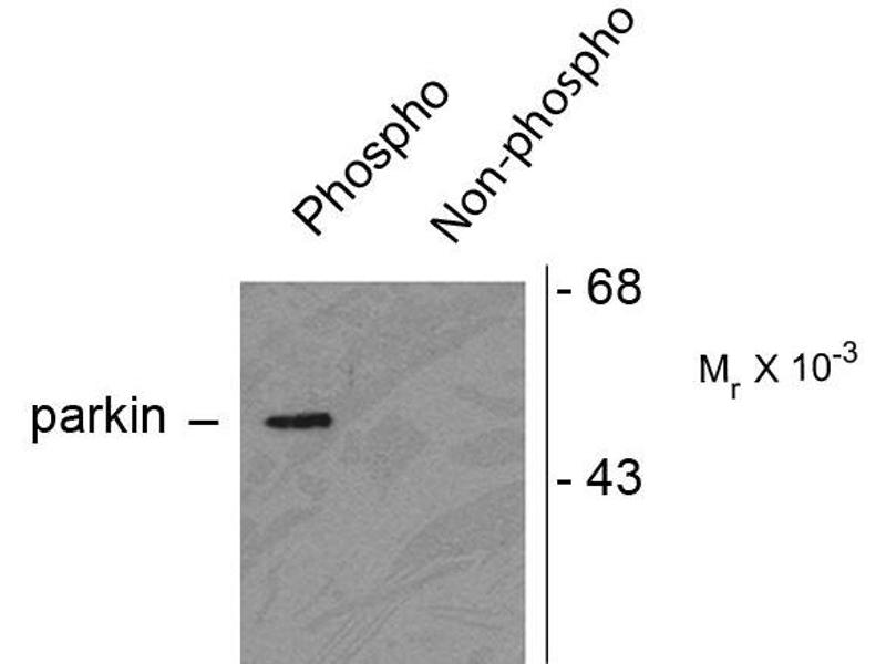 - Specific for the ~52 kDa parkin protein phosphorylated at Ser378. Immunolabeling of the parkin band is absent in parkin S378 mutants.