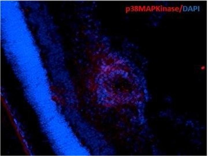 - The MAPK (mitogen activated protein kinase) comprises a family of ubiquitous praline-directed, proteinserine/ threonine kinases which signal transduction pathways that control intracellular events including acute responses to hormones and major developmental changes in organisms (1). This super family consists of stress activated protein kinases (SAPKs), extracellular signal-regulated kinases (ERKs), and p38 kinases, each of which forms a separate pathway (2). The kinase members that populate each pathway are sequentially activated by phosphorylation. Upon activation, p38 MAPK/SAPK2α translocates into the nucleus where it phosphorylates one or more nuclear substrates, effecting transcriptional changes and other cellular processes involved in cell growth, division, differentiation, inflammation, and death (3). Specifically p38 always acts as a pro-apoptotic factor with its activation leading to the release of cytochrome c from mitochondria and cleavage of caspase 3 and its downstream effector, PARP (4). p38 MAPK is activated by a variety of chemical stress inducers including hydrogen peroxide, heavy metals, anisomycin, sodium salicylate, LPS, and biological stress signals such as tumor necrosis factor, interleukin-1, ionizing and UV irradiation, hyperosmotic stress and chemotherapeutic drugs (5). As a result, p38 alpha has been widely validated as a target for inflammatory disease including rheumatoid arthritis, COPD and psoriasis (6) and has also been implicated in cancer, CNS and diabetes (7).