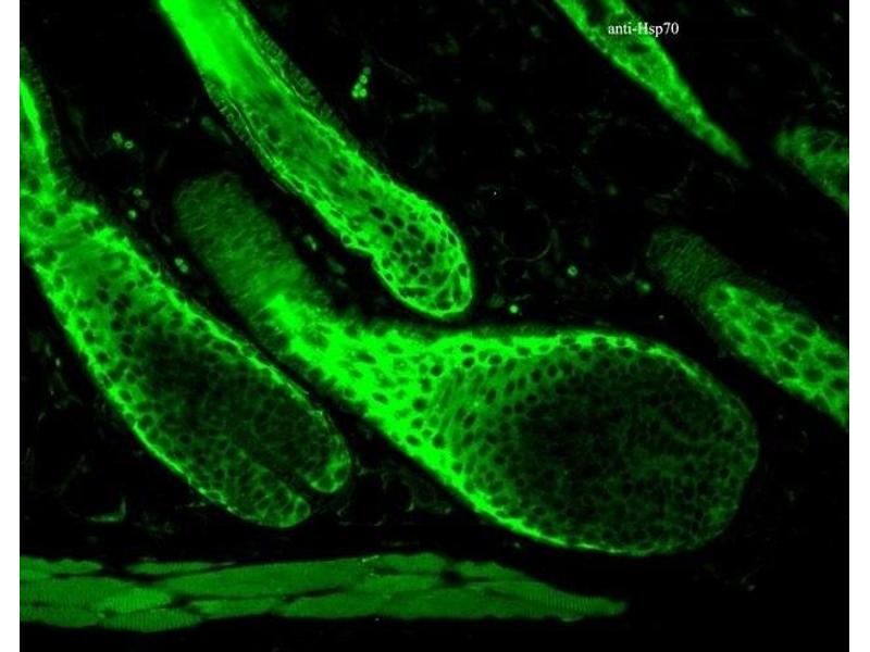 - Detects a ~70 kDa. May cross-react with HSC70 at lower dilutions.
