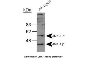 - Reacts with ~53 kDa (alpha form) and at ~42 kDa (beta form) JNK1 from C