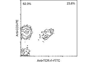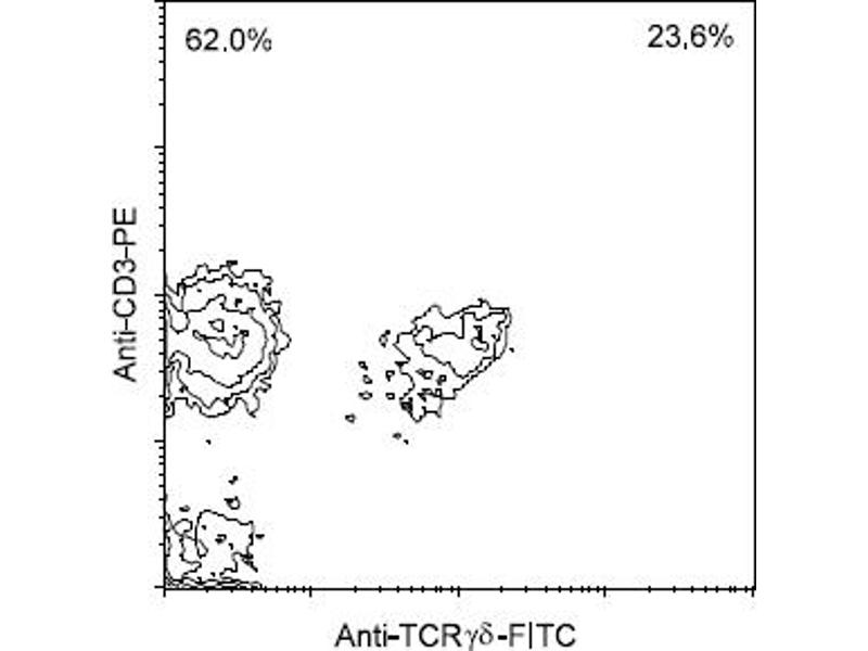 T cell receptors (TCR) recognize foreign antigens which have been processed as small peptides and bound to major histocompatibility complex (MHC) molecules at the surface of antigen presenting cells (APC). Each T cell receptor is a dimer consisting of one alpha and one beta chain or one delta and one gamma chain. Unlike human and mouse, in which gamma/delta cells comprise a minor subset of T lymphocytes in the circulation, the chicken has a relatively large subset of gamma/delta T cells. The frequency of TCR gamma/delta cells is usually 20-25 % of the total blood T cells, but may reach approximately 50 % in chickens of 6 months of age. The majority of TCRgamma/delta+ cells in the thymus and blood are CD4-CD8-, although a small subset of them may express CD8 or CD4 coreceptors. However, when the TCRgamma/delta+ cells migrate into the spleen and intestine, most of them begin to express CD8. Although the biological function of gamma/delta T cells is unclear, they are clearly capable of cytotoxic activity in vitro. The CD8+ gamma/delta T cells may also be involved in down-regulation of the immune response. They cannot, however, induce a graft-vs-host (GVH) reactions.Synonyms: T-Cell Receptor delta, T-Cell Receptor gamma, T-Cell Receptor gamma delta, T-cell receptor T3 gamma/delta, T-cell surface glycoprotein CD3 gamma/delta, TCRD, TCRG