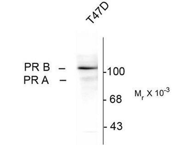 There is accumulating evidence to suggest that progesterone plays an essential role in the regulation of growth and differentiation of mammary glands and thus may play a key role in breast cancer (Edwards, 2005). The biological response to progesterone is mediated by two distinct forms of the human progesterone receptor (PR-A and PR-B forms). In most cell contexts, the B form functions as a transcriptional activator, whereas the A form functions as a transcriptional inhibitor of steroid hormones (Attia et al., 2000, Lin et al., 2003). Recently it has been demonstrated that there is differential hormone dependent regulation of the phosphorylation of the A and B forms of the receptor (Clemm et al., 2000) . Treatment of T47D breast cancer cells with progestin agonist increases the phosphorylation of Ser190 and Ser294 with different kinetics. These phosphorylation events may differentially affect the transcriptional activity of the receptor.Synonyms: NR3C3, Nuclear Receptor Subfamily 3 Group C Member 3, PGR, PR