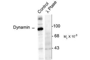 Specific for the ~95k Dynamin protein phosphorylated at Ser774. This antiboy labels the purified protein phosphorylated in vitro by CDK5 but not by PKC. Does not cross react with other purified substrates of CDK5 (e.g. Amphiphysin and Synapsin). Immunolabeling is blocked by lambda-phosphatase treatment.