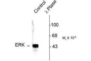 - Recognizes the ~42k-44k ERK/MAPK phosphorylated at Thr202 and Tyr204. Immunolabeling is blocked by the phosphopeptide used as antigen but not by the corresponding dephosphopeptide. The immunolabeling is completely eliminated by lambda-phosphatase.