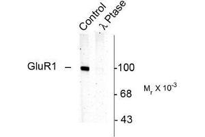 Specific for the ~100k GluR1 protein phosphorylated at Ser831. Immunolabeling is blocked by the phosphopeptide used as antigen but not by the corresponding dephosphopeptide. Immunolabeling is completely eliminated by lambda-phosphatase treatment.
