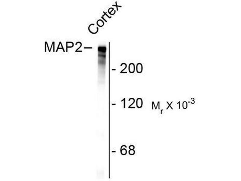 Microtubules are 25nm diameter protein rods found in most kinds of eukaryotic cells. They are polymerized from a dimeric subunit made of one a subunit and one b tubulin subunit. Microtubules are associated with a family of proteins called microtubule associated proteins (MAPs), which includes the protein tau and a group of proteins referred to as MAP1, MAP2, MAP3, MAP4 and MAP5 (Kindler & Gardner 1994). MAP2 is made up of two ~280 kDa apparent molecular weight bands referred to as MAP2a and MAP2b. A third lower molecular weight form, usually called MAP2c, corresponds to a pair of protein bands running at ~70 kDa on SDS-PAGE gels. All these MAP2 forms are derived from a single gene by alternate transcription, and all share a C-terminal sequence which includes either three or four microtubule binding peptide sequences, which are very similar to those found in the related microtubule binding protein tau. MAP2 isoforms are expressed only in neuronal cells and specifically in the perikarya and dendrites of these cells. MAP2 has been recently shown to be the specific receptor for the neurosteroid pregnenolone (Fontaine-Lenore V. et al., 2006).Synonyms: MAP2, Microtubule-associated protein 2, Neuronal Marker