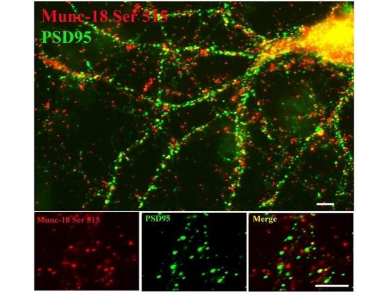 This antibody recognizes ~65k Munc-18 protein phosphorylated at Ser515. Immunolabeling is blocked by the phosphopeptide used as antigen but not by the corresponding dephosphopeptide.