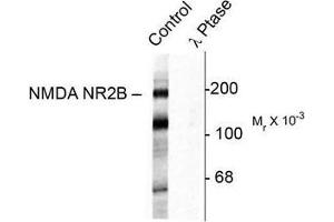 This antibody is specific for the ~180k NMDAR NR2B-subunit protein phosphorylated at Tyr1472 in Western blots. The antibody also labels proteins of ~65k and ~115k. Immunolabeling is completely blocked by blocked by either lambda-Ptase or by the phosphopeptide used as the antigen but not by the corresponding dephosphopeptide.
