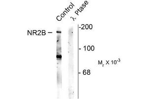 This antibody recognizes the ~180k NMDAR NR2B subunit protein phosphorylated at Ser1480. Immunolabeling of the NMDA NR2B subunit band is blocked by the phosphopeptide used as the antigen but not by the corresponding dephosphopeptide. Immunolabeling is also blocked by lambda-phosphatase treatment.