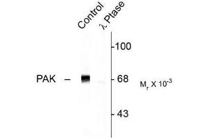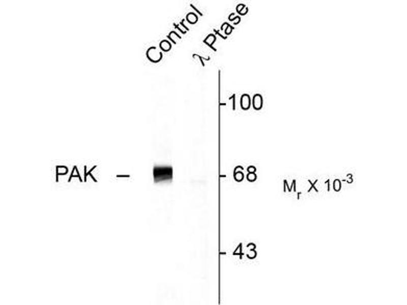 This antibody recognizes the ~68k to ~70k PAK protein phosphorylated at Thr402. The immunolabeling of PAK is completely eliminated by lambda-phosphatase treatment.