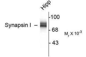 Specific for the ~78k Synapsin I doublet in Western blots of rat brain extracts. Immunolabeling blocked by preadsorption of antibody with the protein used to generate the antibody.