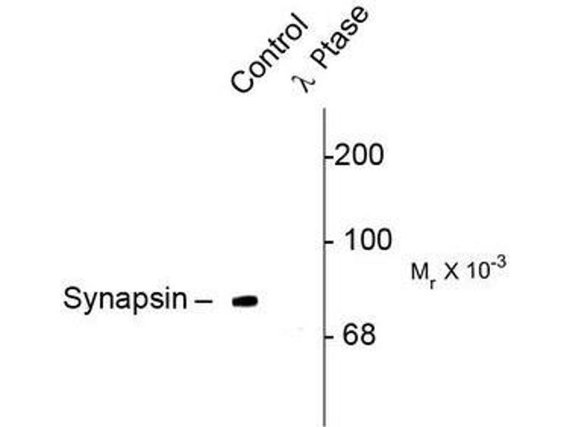 This antibody recognizes the ~78k Synapsin I doublet protein phosphorylated at Ser549. Immunolabeling of the synapsin I band is blocked by lambda-phosphatase treatment.