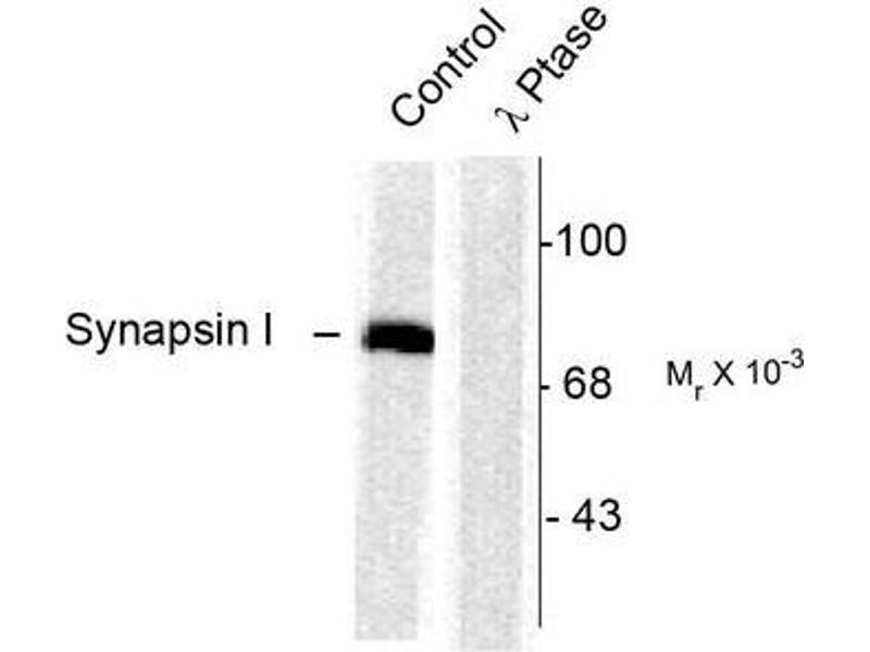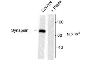 This antibody recognizes ~78k Synapsin I doublet protein phosphorylated at Ser603. Immunolabeling of the synapsin I band is blocked by lambda-phosphatase treatment.