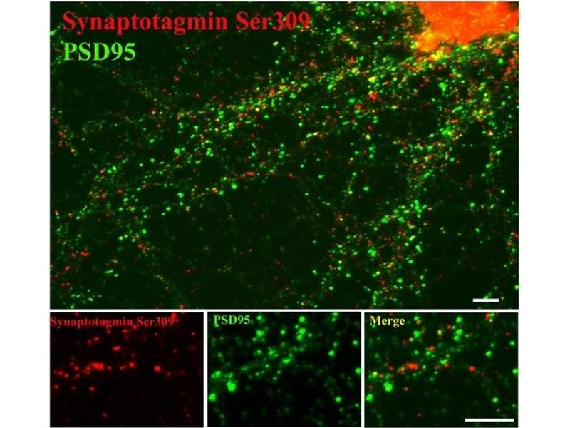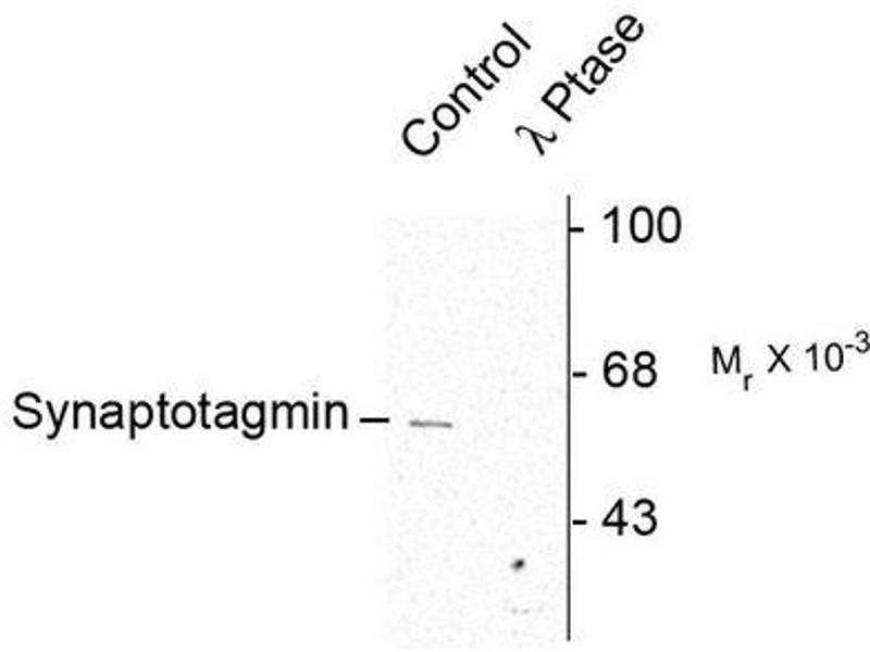 Synaptotagmin is widely regarded as the primary calcium sensor for synaptic vesicle exocytosis (Fernandez-Chacon et al., 2001, Wang et al., 2003). Moreover, recent studies indicate that the protein also plays a key role in endocytosis (Poskanzer et al., 2003). Synaptotagmin can be phosphorylated by multiple protein kinases and this may play a key role in modulation of synaptotagmin's ability to influence both the exocytotic and endocytotic components of synaptic transmission (Hilfiker et al., 1999, Lee et al., 2004).Synonyms: SYT1, SYT2, SYT3, SYT4, SYT5