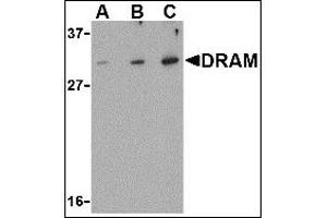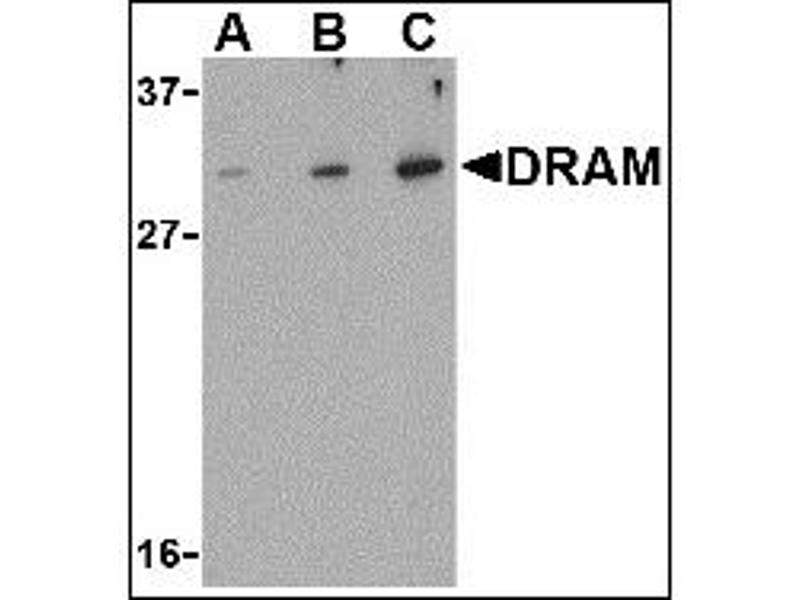 Damage-regulated autophagy modulator (DRAM) is a p53 target gene encoding a lysosomal protein that induces autophagy, a process that degrades cytosolic proteins and organelles. It has been suggested that activation of DRAM by p53 is simultaneous to the activation by p53 of one or more proapoptotic genes such as PUMA, Bax, etc., and that the signaling pathways regulated by these genes promote a full cell death response. By itself, DRAM cannot induce apoptosis, but the fact that it is inactivated in certain cancers highlights the importance of DRAM and suggests that autophagy may play a more important role in cancer than initially suspected. At least two different isoforms of DRAM are known to exist.Synonyms: DNA damage regulated autophagy modulator protein 1, DRAM, DRAM-1, FLJ11259