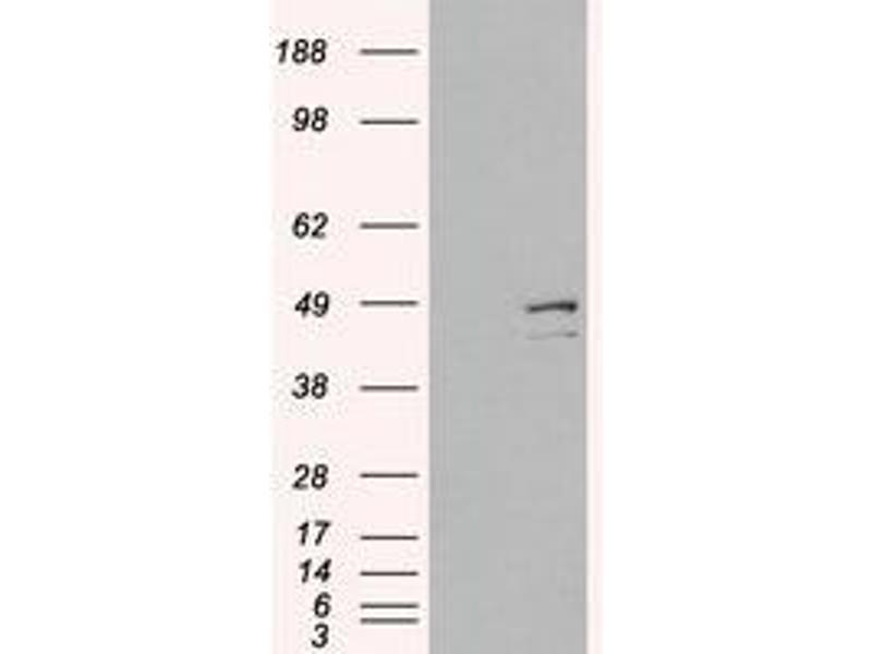 Peptide ELISA: 1/16000. Western blot: 1 - 3 μg/mL. Approx 40-45 kDa band seen in HeLa lysate. Other applications not tested. Optimal dilutions are dependent on conditions and should be determined by the user.