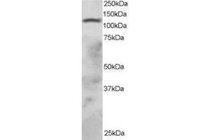 Peptide ELISA: Limit dilution 1: 32000. Western blot: 1-3 μg/mL. Approx 120 kDa band observed in lysates of cell line HepG2. Other applications not tested. Optimal dilutions are dependent on conditions and should be determined by the user.