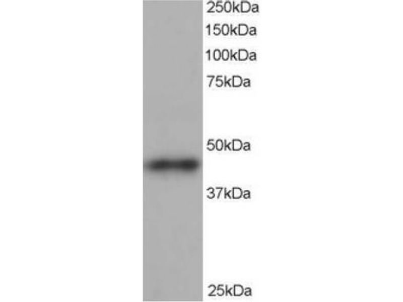 Peptide ELISA: 1/128000. Western Blot: 0.5-2 μg/mL. Approx 45 kDa band observed in human heart and brain lysates(predicted MW of 45 kDa according to NP_005726). Immunohistochemistry: 3-5 μg/mL. In paraffin embedded Human Uterus shows fibrillar staining of cytoplasm in endometrialcells. Other applications not tested. Optimal dilutions are dependent on conditions and should be determined by the user.