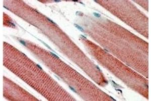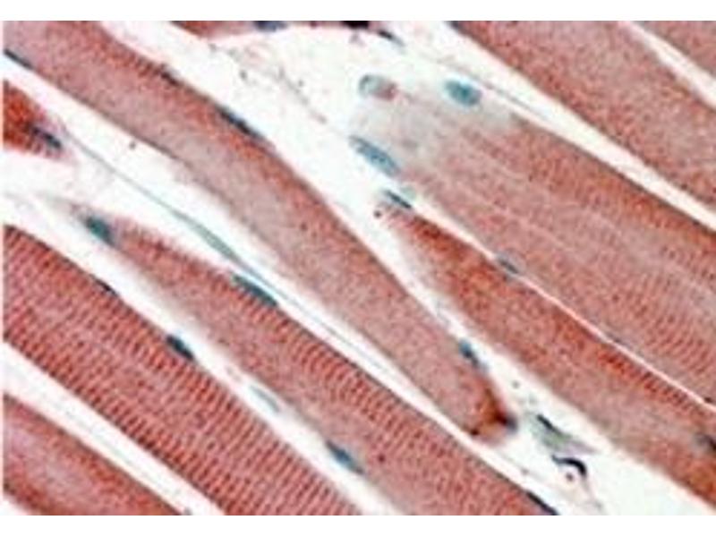 Peptide ELISA: 1/8000. Western blot: 0.3-1.0 μg/mL. Approx 35 kDa band observed in Human Heart lysates(calculated MW of 33.5 kDa according to NP_054862.1). Immunohistochemistry: 4-6 μg/mL. In paraffin embedded Human Skeletal Muscle shows staining of the striated muscularfibres. Other applications not tested. Optimal dilutions are dependent on conditions and should be determined by the user.