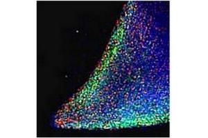 Peptide ELISA: 1/64000. Western blot: 0.03-0.1 μg/mL. Approx 38 kDa band observed in Human Ovary lysates(calculated MW of 34.8 kDa according to NP_079141.1). Immunofluorescence: Parts of a keratinocyte-derived colony of induced pluripotent stemcells are stained for Nanog (green). (See also Ref.2)This antibody does not work in PFA-fixed frozen embryos and ESC from Mouse. Other applications not tested. Optimal dilutions are dependent on conditions and should be determined by the user.