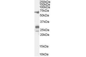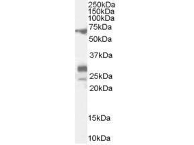 Peptide ELISA: antibody detection limit dilution 1: 32000. Western blot: 0.1-0.3 μg/mL. Approx 70 kDa band observed in Rat Spleen and Testis lysates(calculated MW of 66.0 kDa according to NP_958797.2). Additional bands of unknownidentity was also consistently observed at 28+20 kDa. These bands were successfullyblocked by incubation with the immunising peptide. We would appreciate any feedbackfrom people in the field - have any such results been reported with otherantibodies/lysates? Have any further splice variants/modified forms been reported?
