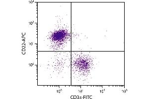 CD22, also known as Lyb-8, is a heterodimeric transmembrane glycoprotein and a member of a structurally related group of immunoglobulin (Ig) superfamily domain-containing proteins called the sialoadhesin family. It is detected in the cytoplasm early in B cell development (late pro-B cell stage), appears on the cell surface concomitant with IgD, and is found on most IgM + IgD + mature B lymphocytes. Expression is lost with terminal differentiation of B cells and is absent on plasma cells. Activation of B cells via cross-linking of surface Ig increases CD22 expression. CD22 associates with the B cell receptor (BCR) complex and mediates intercellular adhesion. Its intracellular domain is phosphorylated after antigen receptor cross- linking and is involved in negative regulation of B-cell activation.