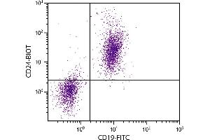 CD24 is expressed in B cells until their terminal differentiation into plasma cells. It has been used widely as a marker to fractionate different B-lineage differentiation stages. CD24 has been found on a variety of other hematopoietic and neural cell types, and is now classified as a costimulatory molecule. The CD24/HSA molecule is composed mostly of carbohydrate, with a protein core of only 31-35 AA in the human and 27 AA in the mouse. The molecular mass is variable, ranging from 38-70 kDa. CD24 is now included in the large group of phosphatidylinositol-anchored membrane proteins. Studies with purified CD24 applied to latex beads have demonstrated a self-binding property, suggesting that the molecule is capable of promoting homotypic aggregation, binding and cell adhesion. This is supported by earlier observations of the blockade of B cell lymphoblast aggregation with anti-CD24 monoclonal antibody. Recent studies of murine CD24 have assigned a role for CD24/HSA as a ligand for P-selectin, a calcium-dependent lectin.