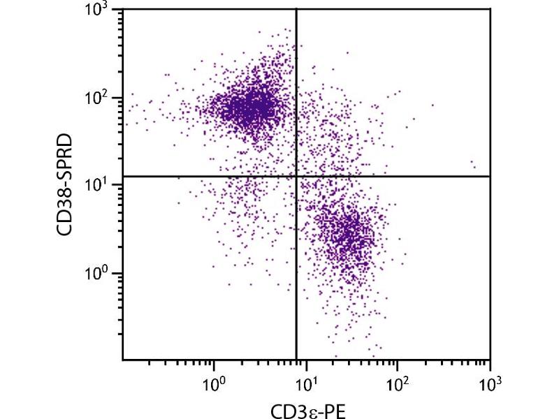 Murine CD38, a type II transmembrane glycoprotein, is a bifunctional ectoenzyme capable of catabolizing nicotinamide adenine dinucleotide (NAD+) to cyclic ADP-ribose (cADPR), and then hydrolyzing cADPR to adenosine diphosphoribose (ADPR). It is expressed at high levels on the surface of peripheral B-lineage cells, and at low density on germinal center B cells from unimmunized mice. 4 It has also been reported to be expressed at moderate levels on NK cells, a proportion of peripheral T cells, and a subpopulation of thymocytes which are mostly TCR αβ +, CD4 -, CD8 -. Murine CD38 is also expressed by all Mac-1 + macrophages in the peritoneal cavities of unimmunized mice, but not by unstimulated bone-marrow-derived macrophages. Monoclonal antibodies to CD38 have been shown to induce B- and T-cell proliferation, protect B cells from apoptosis, and inhibit B lymphopoiesis.