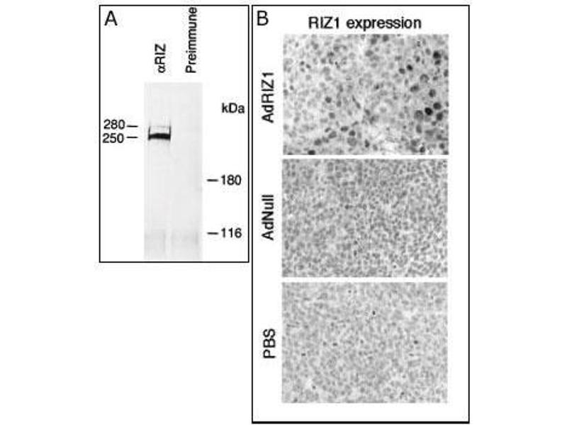 PRDM2 is a 250-kD nuclear protein containing 8 zinc finger motifs. It contains an RB-binding motif that is related to that of the adenovirus E1A oncoprotein, RIZ also shares an antigenic epitope with the C terminus of E1A. It is expressed in human retinoblastoma cells and at low levels in all other human cell lines examined. Using fluorescence in situ hybridization, the PRDM2 gene has been mapped to 1p36. PRDM2 may be a candidate target of 1p36 alterations that commonly occur in neuroendocrine, breast, liver, colon, skin, and lymphoid tumors.