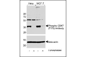 This CDK7 Antibody is generated from rabbits immunized with a KLH conjugated synthetic phosphopeptide corresponding to amino acid residues surrounding T170 of human CDK7.