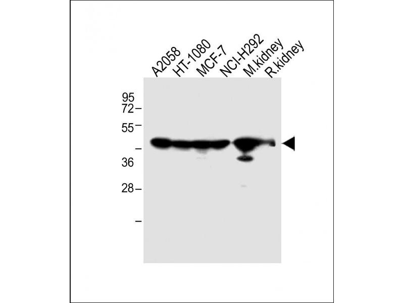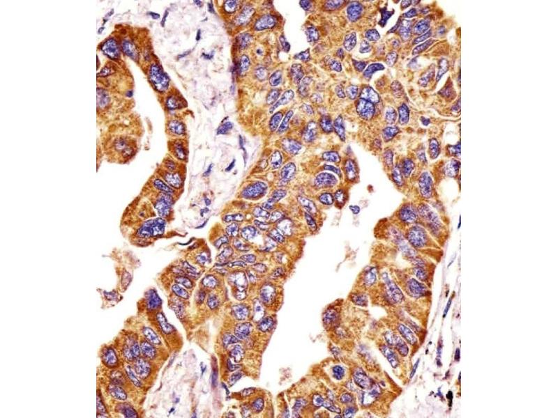 Proteins of the matrix metalloproteinase (MMP) family are involved in the breakdown of extracellular matrix in normal physiological processes, such as embryonic development, reproduction, and tissue remodeling, as well as in disease processes, such as arthritis and metastasis. Most MMPs are secreted as inactive proproteins which are activated when cleaved by extracellular proteinases. MMP14 seems to specifically activate progelatinase A, and may thus trigger invasion by tumor cells by activating progelatinase A on the tumor cell surface. Expression is significant in stromal cells of colon, breast, and head and neck.
