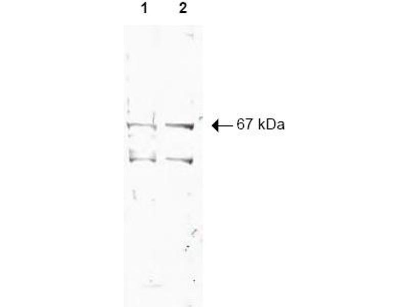 ELISA: 1/3000-1/10000. Western Blot: 1/500-1/2000. Immunohistochemistry on Paraffin Sections: 2 mg/mL-5 μg/mL. Expect a band approx. 67 kDa in size corresponding to NRF1 by Western blotting in theappropriate cell lysate or extract. Splice variants exist for this protein that may result in the detection of Lower MolecularWeight bands.