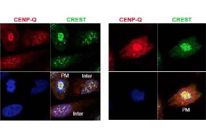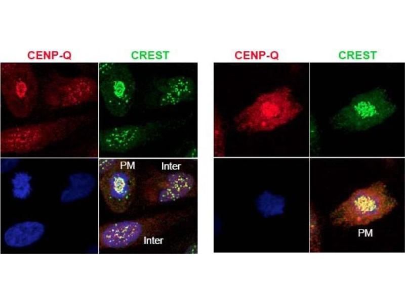 Cenp-Q (also known as centromere protein Q or CENPQ) is a nuclear/centromeric protein that is one of the critical components that constitutes the CENP-O complex at the kinetochores and appears to stabilize PBIP1/CENP-U(50)/MLF1IP in the complex. This complex is important for proper recruitment of polo-like kinase 1 (Plk1) to the mitotic kinetochores. A failure in this process results in improper microtubule attachment to the kinetochores and chromosome missegregation that ultimately lead to aneuploidy.Synonyms: C6orf139, CENPQ, Centromere protein Q, chromosome 6 open reading frame 139