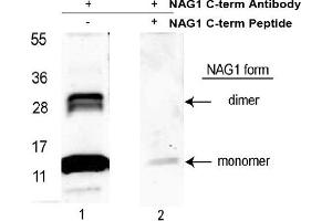 The non-steroidal antiinflammatory drug (NSAID) activated gene (NAG-1) is a member of the transforming growth factor-beta (TGF-beta) superfamily. NAG-1 is also known as Macrophage Inhibitory Cytokine-1 (MIC-1), Growth Differentiation Factor 15 (GDF15), Placental Bone Morphogenetic Protein (PLAB), or Prostate Derived Factor (PDF). NAG-1 is expressed in human placenta, prostate and colon. It possesses antitumorigenic and proapoptotic activities. NAG-1 expression is dramatically increased in inflammation, injury and malignancy. Increase of NAG-1 expression is a feature of many cancers including breast, colon, pancreas and prostate. In a number of studies, NAG-1 expression was increased by a number of NSAIDs. This increase in expression may correlate with the chemopreventive effect NSAIDs seem to have with certain cancers. NAG-1 expression is also induced by PPAR gamma ligands and by several dietary compounds such as conjugated linoleic acids (CLAs), naturally occurring fatty acids in ruminant food products, indoles, epicatechin gallate, and genistein. The induced expression of NAG-1 results in a stimulation of apoptosis and inhibition of cell growth. Inhibition of NAG-1 induced expression by small interference RNA (siRNA) results in repression of induced apoptosis. NAG-1 expression is regulated by a numbers of transcription factors such as ERG-1 and Sp1. EGR-1 may be necessary for NSAID-induced NAG-1 expression. The study of expression of NAG-1 proteins, including variants, is important to define their potential role as serum biomarkers for cancer diagnosis, treatment monitoring, epidemiology study, and nutrition surveys.Synonyms: GDF-15, Growth/differentiation factor 15, MIC-1, MIC1, Macrophage inhibitory cytokine 1, NAG-1, NRG-1, NSAID-activated gene 1 protein, NSAID-regulated gene 1 protein, PDF, PLAB, PTGFB, Placental TGF-beta, Placental bone morphogenetic protein, Prostate differentiation factor