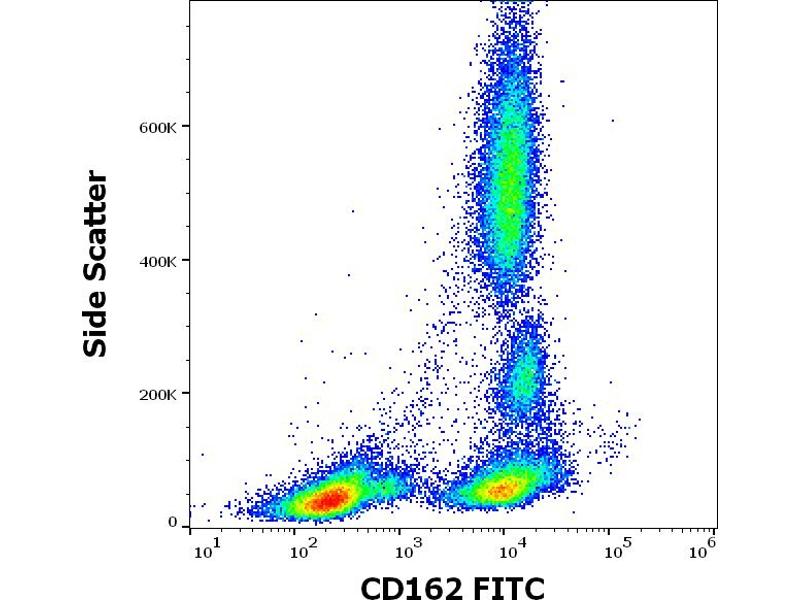 The antibody TC2 reacts with an extracellular epitope of CD162, a 220 kDa type I integral membrane protein expressed as disulfide-linked homodimer (sialomucin family). CD162 is present on the most peripheral blood T lymphocytes, monocytes, granulocytes, it is also expressed on a subpopulation of B lymphocytes and CD34+ bone marrow cells.