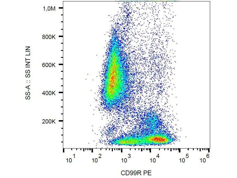 CD99 (E2, MIC2) is a transmembrane glycoprotein that is involved in regulation of T cell addhesive properties and programmed cell death distinct from typical apoptosis course. CD99 roles are specific to certain stages of T cell differentiation such as corticothymocytes. CD99R isoform expression is restricted in the haematopoietic system to T, NK and myeloid cells.,MIC2, HBA71, blood group Xg
