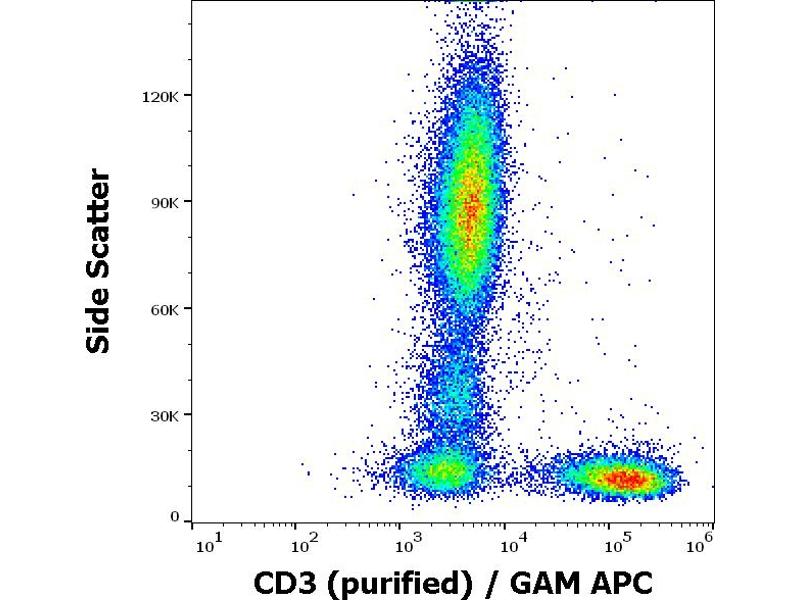 - CD3 antigen, epsilon polypeptide,CD3 complex is crucial in transducing antigen-recognition signals into the cytoplasm of T cells and in regulating the cell surface expression of the TCR complex. T cell activation through the antigen receptor (TCR) involves the cytoplasmic tails of the CD3 subunits CD3 gamma, CD3 delta, CD3 epsilon and CD3 zeta. These CD3 subunits are structurally related members of the immunoglobulins super family encoded by closely linked genes on human chromosome 11. The CD3 components have long cytoplasmic tails that associate with cytoplasmic signal transduction molecules. This association is mediated at least in part by a double tyrosine-based motif present in a single copy in the CD3 subunits. CD3 may play a role in TCR-induced growth arrest, cell survival and proliferation. The CD3 antigen is present on 68-82 % of normal peripheral blood lymphocytes, 65-85 % of thymocytes and Purkynje cells in the cerebellum. It is never expressed on B or NK cells. Decreased percentages of T lymphocytes may be observed in some autoimmune diseases.,CD3E, T3E, TCRE