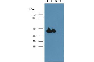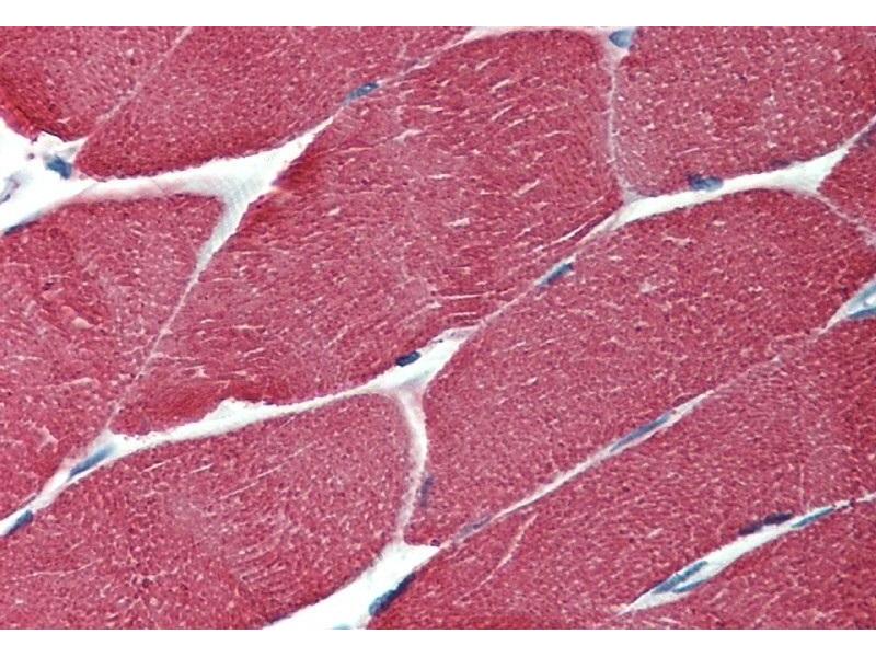 Western blotting: Recommended dilution: 1 μg/mL, positive control: murine femoral muscle, murine heart, negative control: HUVEC line, reducing conditions.