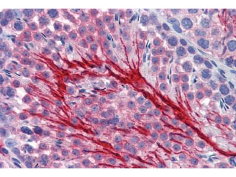 Usage: Immunohistochemistry: This antibody was validated for use in immunohistochemistry on a panel of formalin-fixed, paraffin-embedded (FFPE) mouse tissues after heat induced antigen retrieval in pH 6.0 citrate buffer. After incubation with the primary antibody, slides were incubated with biotinylated secondary antibody, followed by alkaline phosphatase-streptavidin and chromogen. The stained slides were evaluated by a pathologist to confirm staining specificity. The optimal working concentration for this antibody was determined to be 10 μg/mL. -