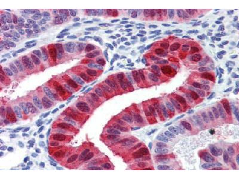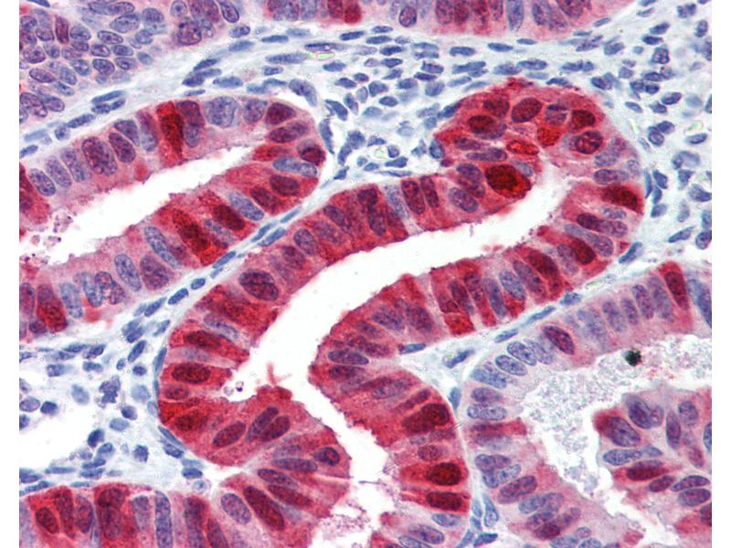 Usage: Immunohistochemistry: This antibody was validated for use in immunohistochemistry on a panel of 21 formalin-fixed, paraffin-embedded (FFPE) human tissues after heat induced antigen retrieval in pH 6.0 citrate buffer. After incubation with the primary antibody, slides were incubated with biotinylated secondary antibody, followed by alkaline phosphatase-streptavidin and chromogen. The stained slides were evaluated by a pathologist to confirm staining specificity. The optimal working concentration for this antibody was determined to be 10 μg/mL -