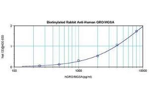 Usage: The applications listed have been tested for the unconjugated form of this product. Other forms have not been tested. ELISA: To detect Human GRO/MGSA by direct ELISA (using 100 μL/well antibody solution) a concentration of 0.25-1 μg/mL of this antibody is required. This biotinylated polyclonal antibody, in conjunction with compatible secondary reagents, allows the detection of at least 0.2-0.4 ng/well of recombinant Human GRO/MGSA. To detect Human GRO/MGSA by sandwich ELISA (using 100 μL/well antibody solution) a concentration of 0.25-1 μg/mL of this antibody is required. This biotinylated polyclonal antibody, in conjunction with Polyclonal Anti-Human GRO/MGSA (LS-C104351) as a capture antibody, allows the detection of at least 0.2-0.4 ng/well of recombinant Human GRO/MGSA. Western Blot: To detect Human GRO/MGSA by Western Blot analysis this antibody can be used at a concentration of 0.1-0.2 μg/mL. Used in conjunction with compatible secondary reagents the detection limit for recombinant Human GRO/MGSA is 1.5-3 ng/lane, under either reducing or non-reducing conditions. -