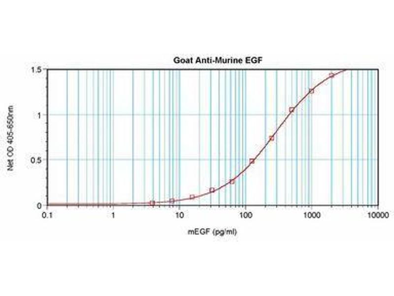 Usage: Neutralization: To yield one-half maximal inhibition [ND] of the biological activity of Murine EGF (0.1 ng/mL), a concentration of 3-5 ng/mL of this antibody is required. ELISA: To detect mEGF by sandwich ELISA (using 100 μL/well antibody solution) a concentration of 0.5-2 μg/mL of this antibody is required. This antigen affinity purified antibody, in conjunction with Biotinylated Anti-Murine EGF (LS-C104401) as a detection antibody, allows the detection of at least 0.2-0.4 ng/well of recombinant mEGF. Western Blot: To detect mEGF by Western Blot analysis this antibody can be used at a concentration of 0.1-0.2 μg/mL. Used in conjunction with compatible secondary reagents the detection limit for recombinant mEGF is 1.5-3 ng/lane, under either reducing or non-reducing conditions. -